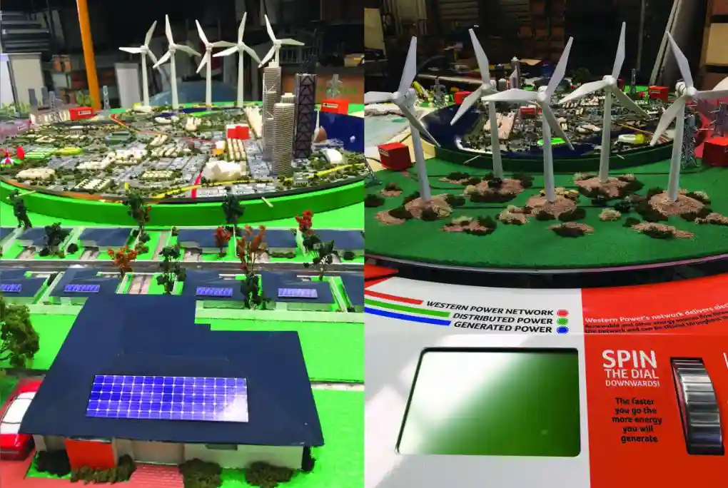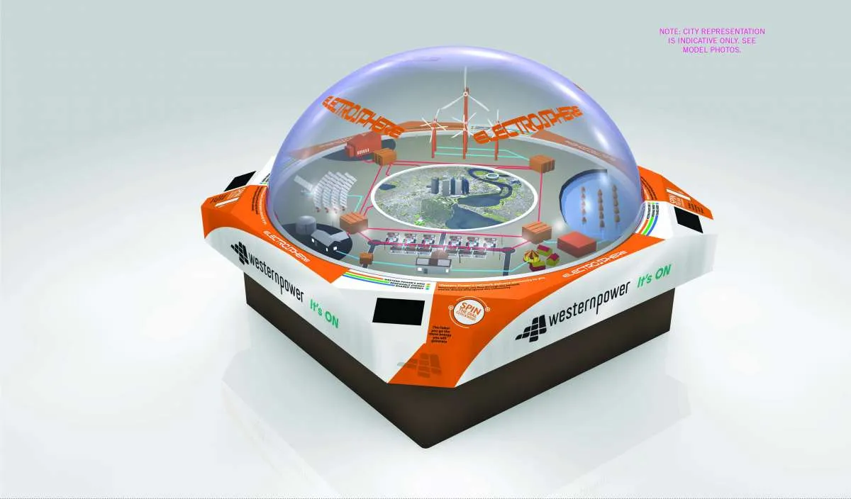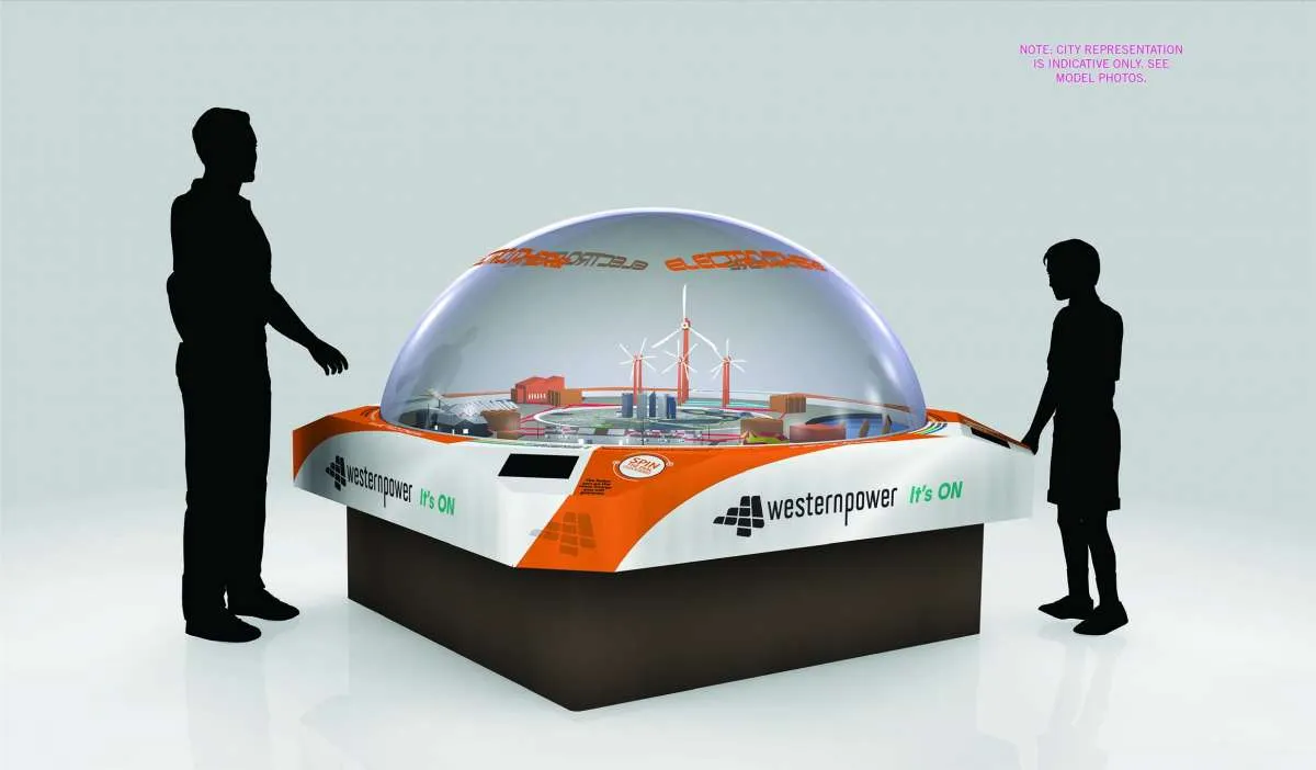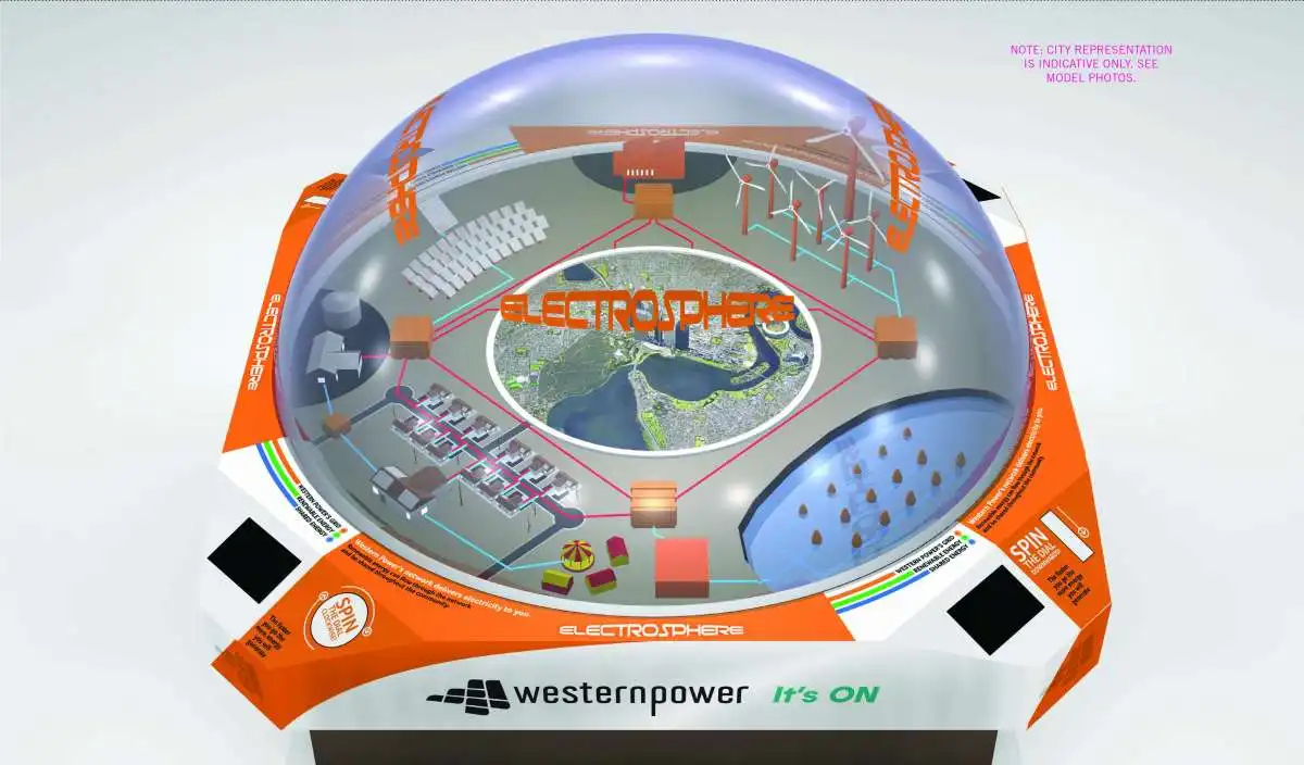 The Electrosphere allows 4 users to see  the new matrix of renewable energy power options of Solar, Battery, Wave and the Power Grid are used and to try and achieve a set Power Target by spinning the dials on the model. The Pod has a looping presentation that explains how the existing Power System works, plus information on upcoming technology and potential uses & efficiencies. The Electrosphere Model and Pod will be used at Public Locations to help educate and inform about Western Powers capabilities State-wide.